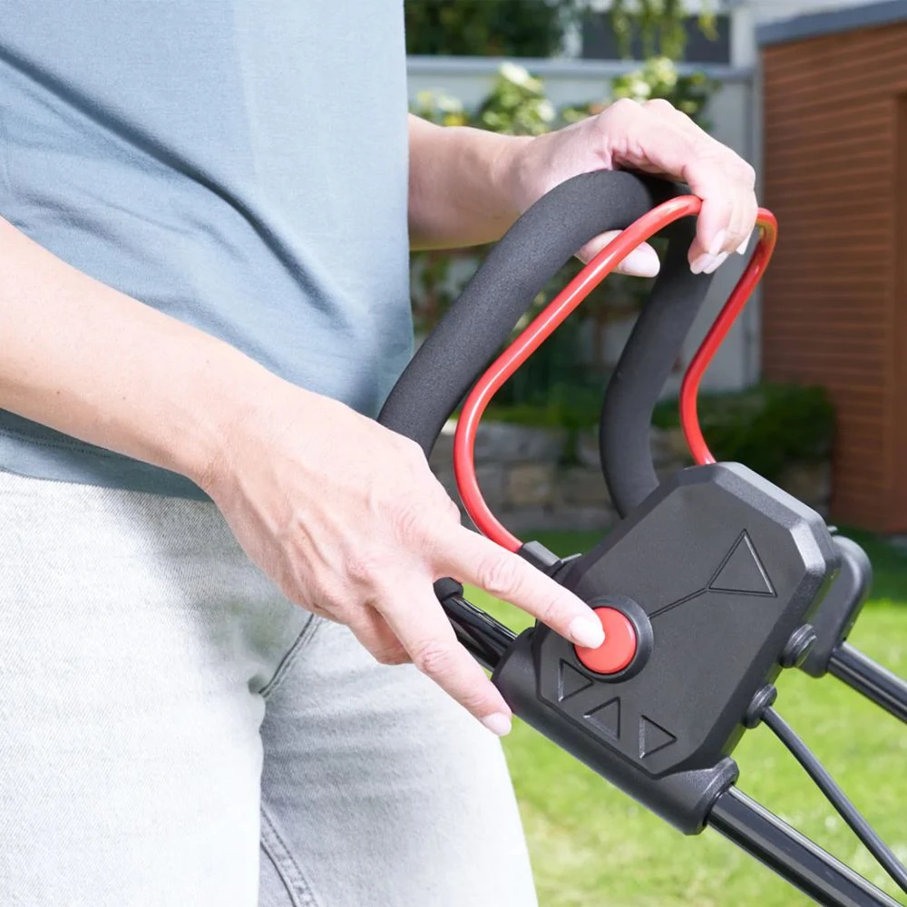 Lightweight at 11.7kg, the mower features a useful carry handle, whilst the standard handles have a fixed base and wingnut for folding down for more compact storage in your garden shed or garage.
