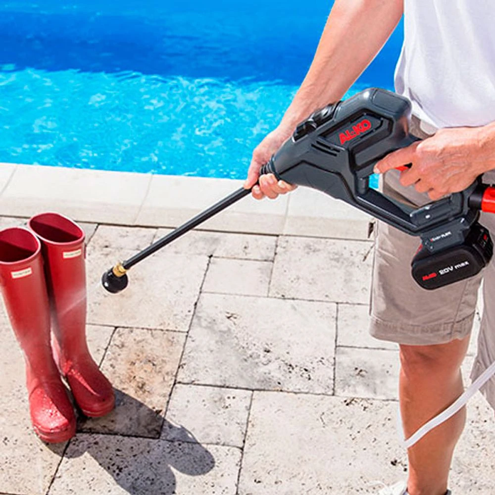 A handy cordless pressure washer from the AL-KO EasyFlex can be used to remove dirt without a power or water connection.