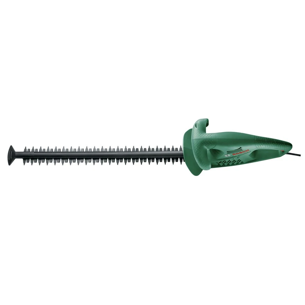 The hedge trimmer is powered by a high speed 450W motor which delivers powerful, quick, clean cuts. The 55cm blade length and 16mm tooth spacing design make this hedge trimmer ideal for light trimming work. The blade tip protector ensures safe trimming along walls and paths.