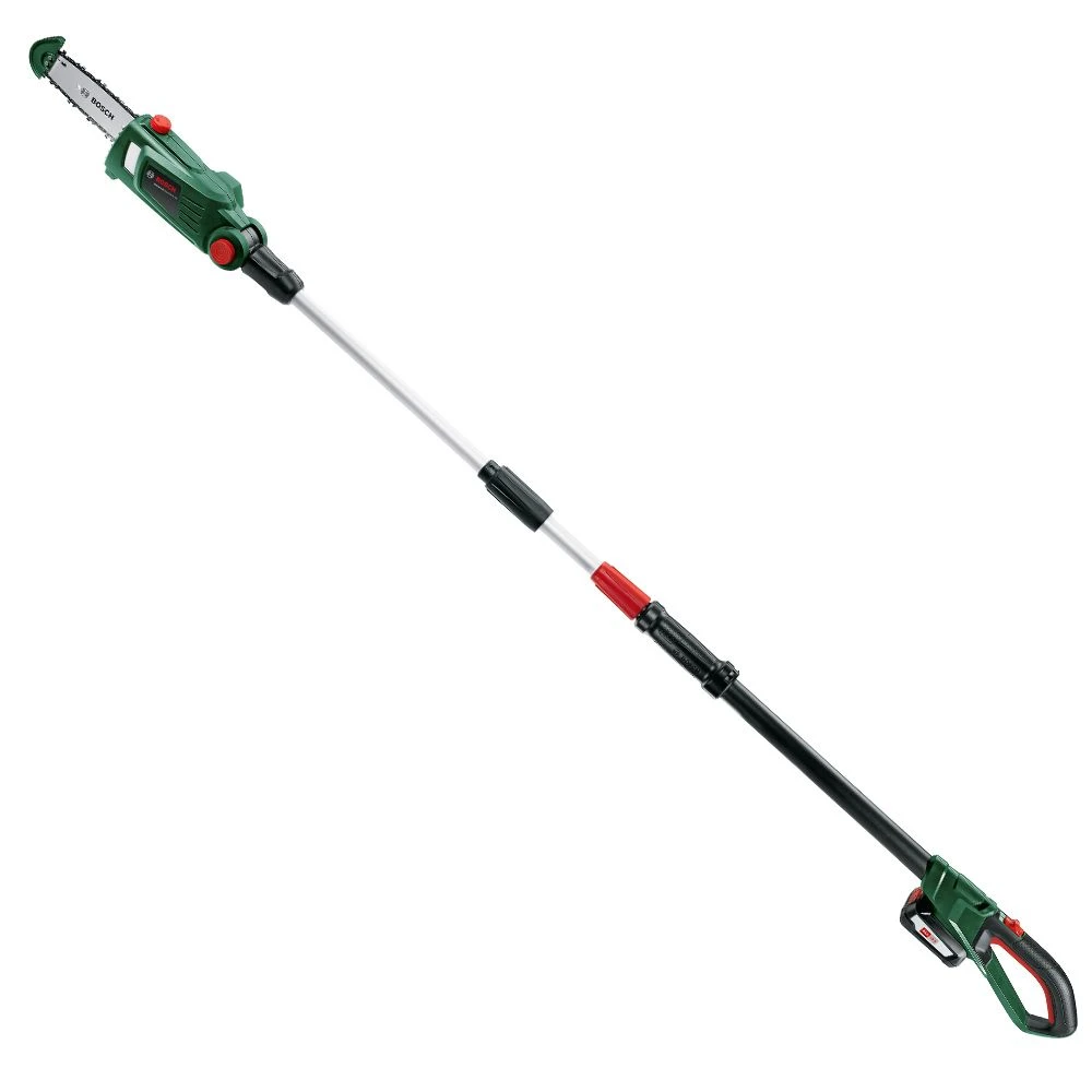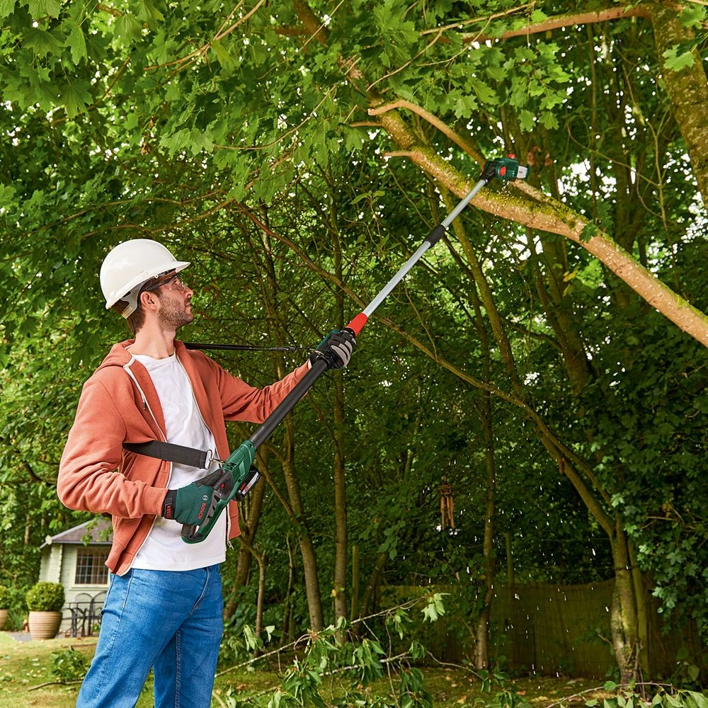 Powered by a Bosch POWER FOR ALL 18V 2.5Ah battery, the pole saw features a telescopic head and pivoting head. The well-balanced, leightweight and ergonimic design minimises strain on arms and shoulders, whilst the tip protector and bumper spike offer maximum control while cutting and undercutting.