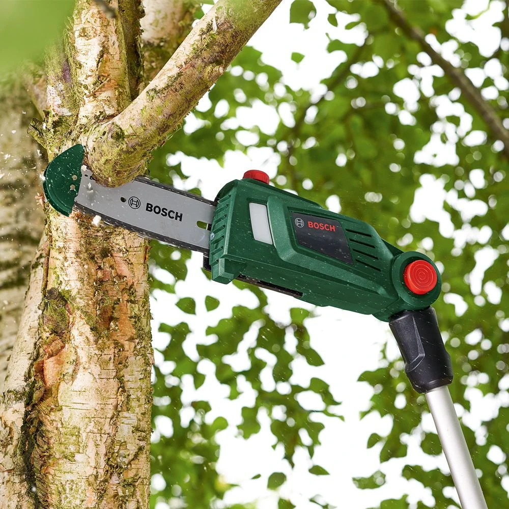 Prune branches in hard-to-reach areas safely and effortlessly with the Bosch UniversalChainPole 18 cordless pole saw.