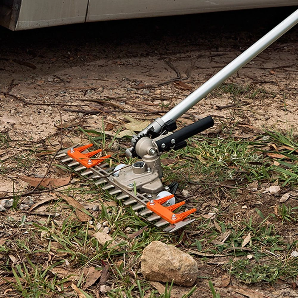 The 464mm-wide cutting head sits on two wheels and sleds, which allow smooth and effortless operation on both flat and uneven surfaces. Large areas can be trimmed by sweeping back and forth, whilst the angle of the gearcase can be adjusted for maximum comfort when operating. The auto-boost function helps to clear thick grass and brush. The double-sided blades with 30mm tooth spacing can be removed for easy maintenance.Â