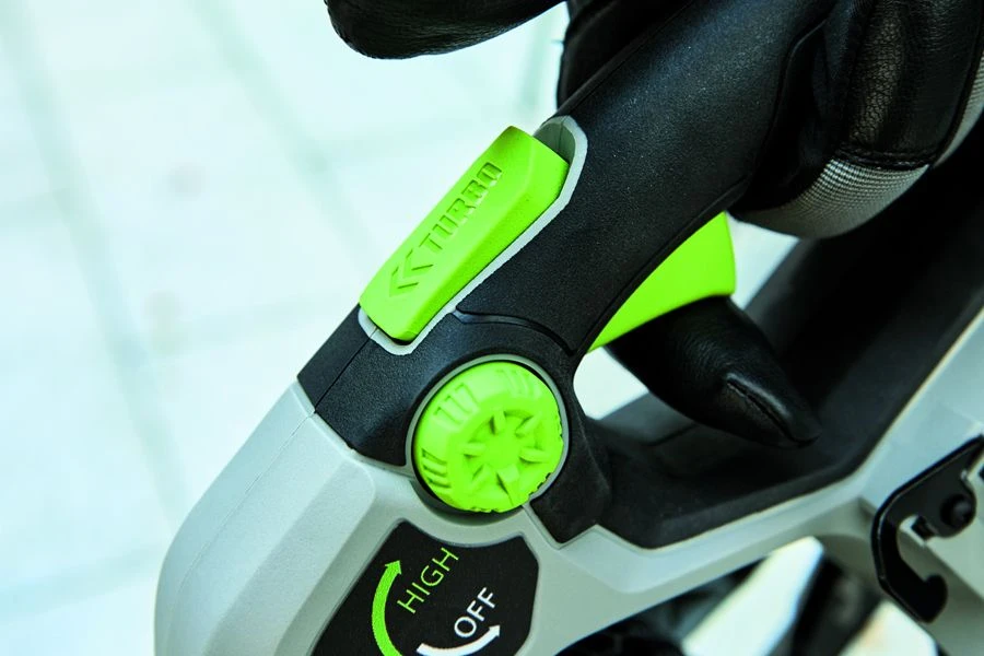 Well-balanced, the machine naturally creates a good working angle with the ground so you never feel like you’re fighting it, even when working at maximum airflow. The controls are located at the top end of the handle with a chunky dial so you can stay on top of the power output while you’re working and a turbo button that when pushed will get you to max power and then back to your previous output in an instant.