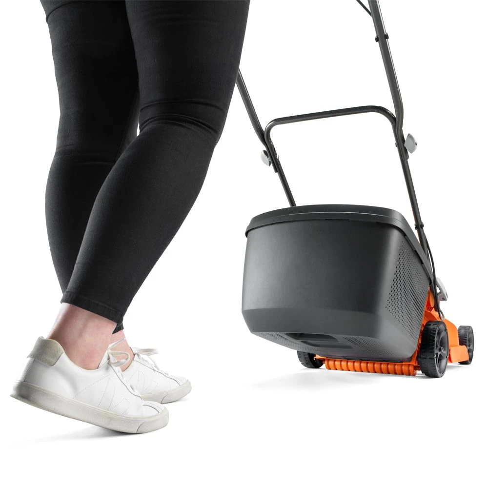 The cut grass is collected in a 35 litre capacity grass box with tongue design to make it easier to remove and dispose of the clippings, and features a full grass box indicator allows you to easily see when the grass box needs emptying.