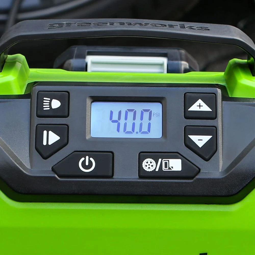 With the GreenWorks portable tyre inflator, you don’t need to worry about over-inflation. Set the desired PSI and the unit will shut-off automatically once it is reached. The digital pressure gauge displays the current pressure in 1PSI increments.