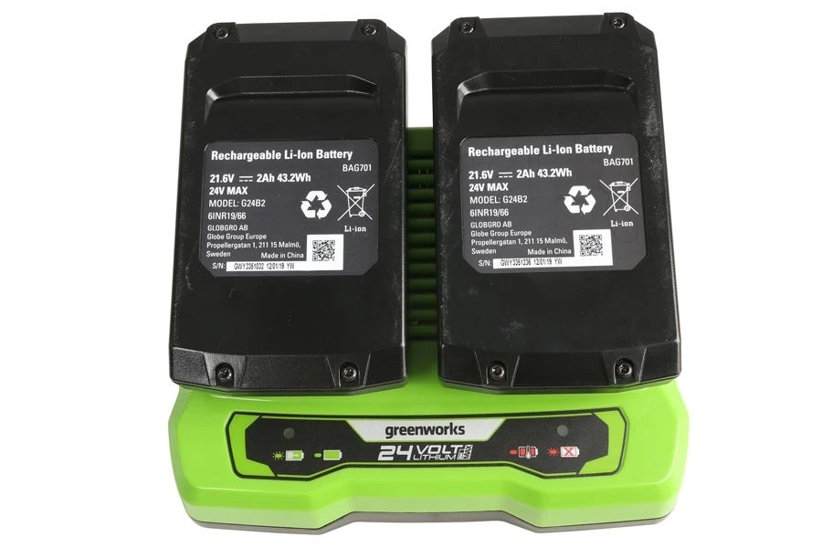 Supplied with two 24V 4Ah batteries, the dual port charger lets you charge both batteries simultaneously.  A useful built-in LED indicator will let you know when the battery is fully charged and, as the charger is wall mountable, it enables quick and convenient access. Folding handlebars on the lawn mower allow compact storage and ease of transportation.