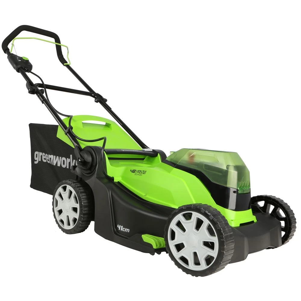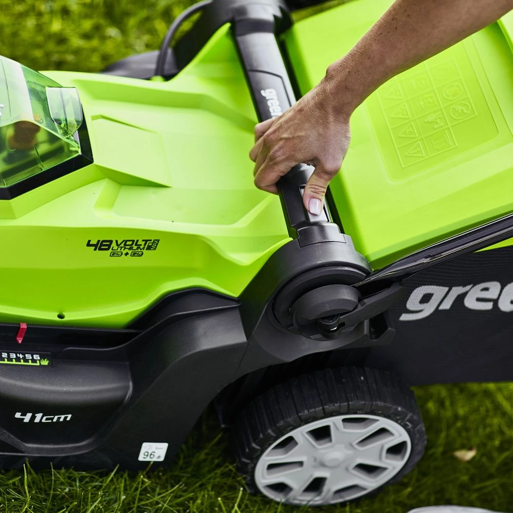 Employing two 24V lithium-ion batteries in parallel to deliver 48V of running power, this versatile GreenWorks 41cm cordless lawn mower has 3-in-1 functionality.