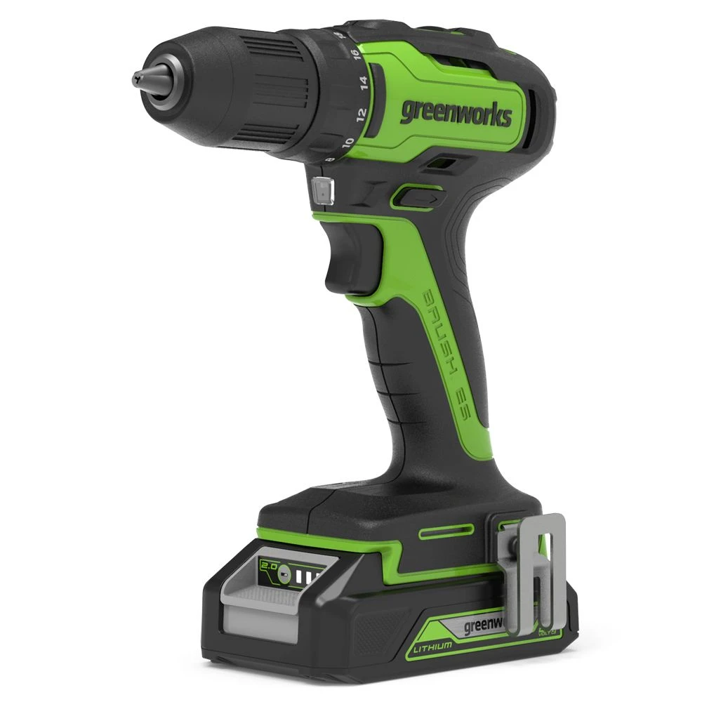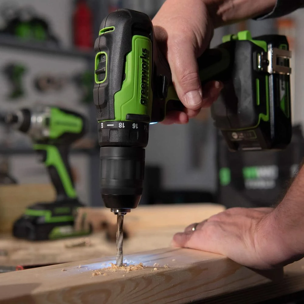 The Greenworks GD24DD35K2 offers total convenience, with no electric cables to deal with. Instead simply insert the advanced 24V battery and you are ready to work. As part of the Greenworks 24V family, the battery can be used in a range of different tools, from angle grinders, impact drivers, circular saws and even garden machinery.