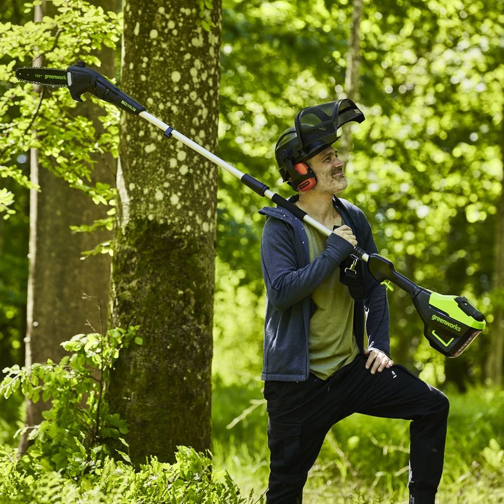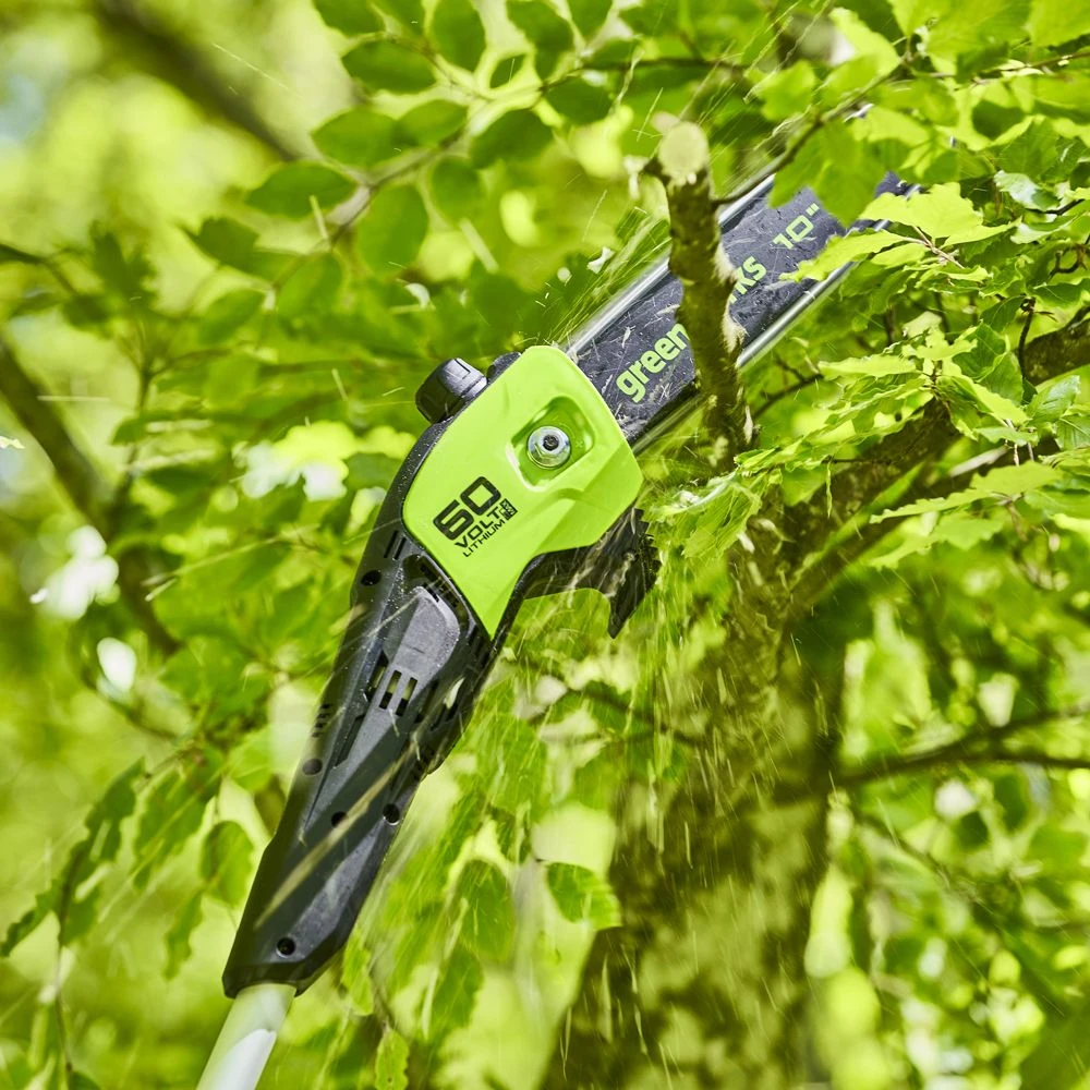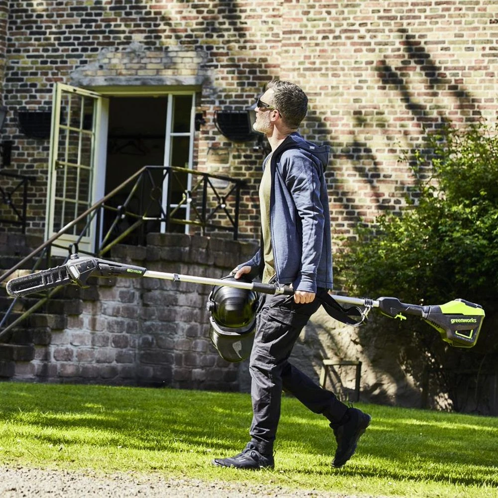 The result of the latest battery and motor technology with top-class chainsaw expertise, GreenWorks brings you the GD60PS25 60 volt cordless pole saw. Great news for demanding gardeners and professionals alike, the pole pruner features a brushless ‘DigiPro’ motor which delivers 30% more power and up to 70% less vibration than petrol, without the toxic emissions, noise and running costs.