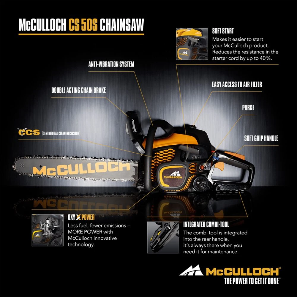 Ideal for demanding tasks the McCulloch CS 50S is a 50cc petrol-powered chainsaw that has an power output of 2.1kW.