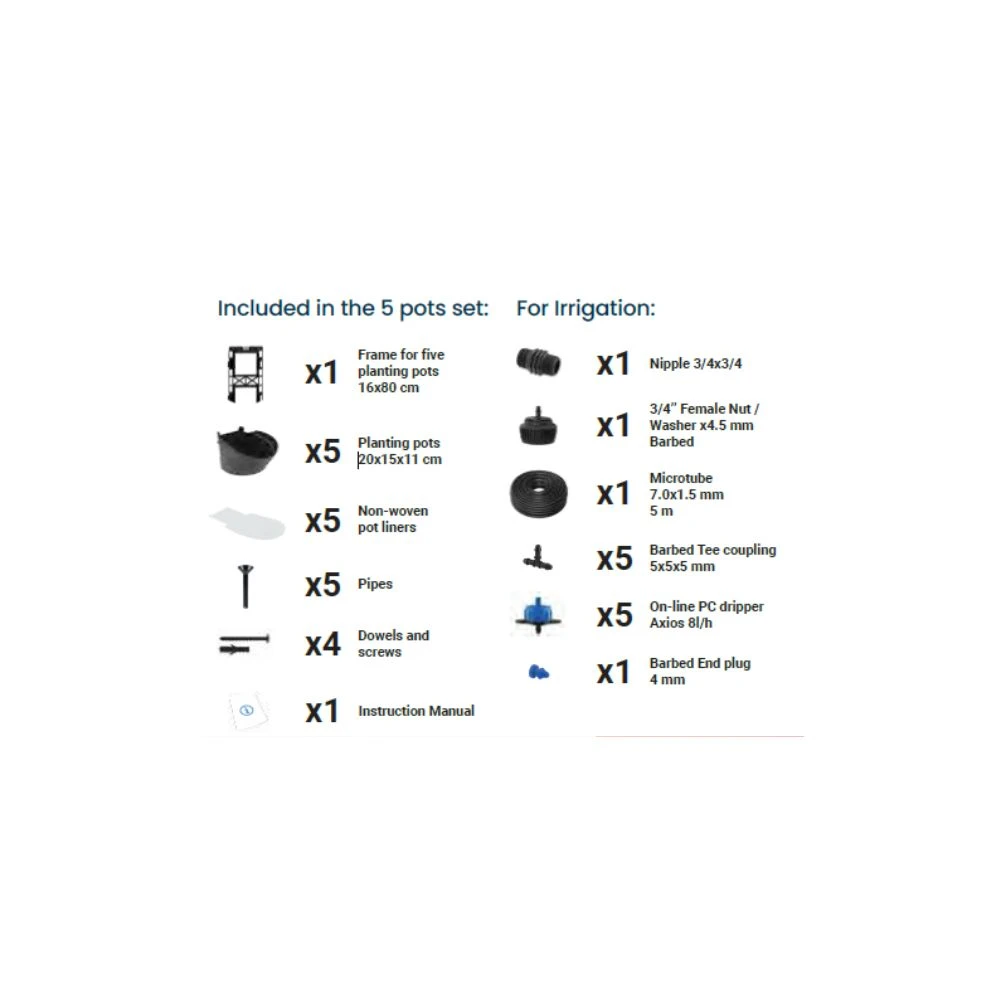 The living wall kit can be used horizontally or vertically and features an automatic drip irrigation system. The black polyproylene panel and pots are UV stable, heat- and chemical-resistant.