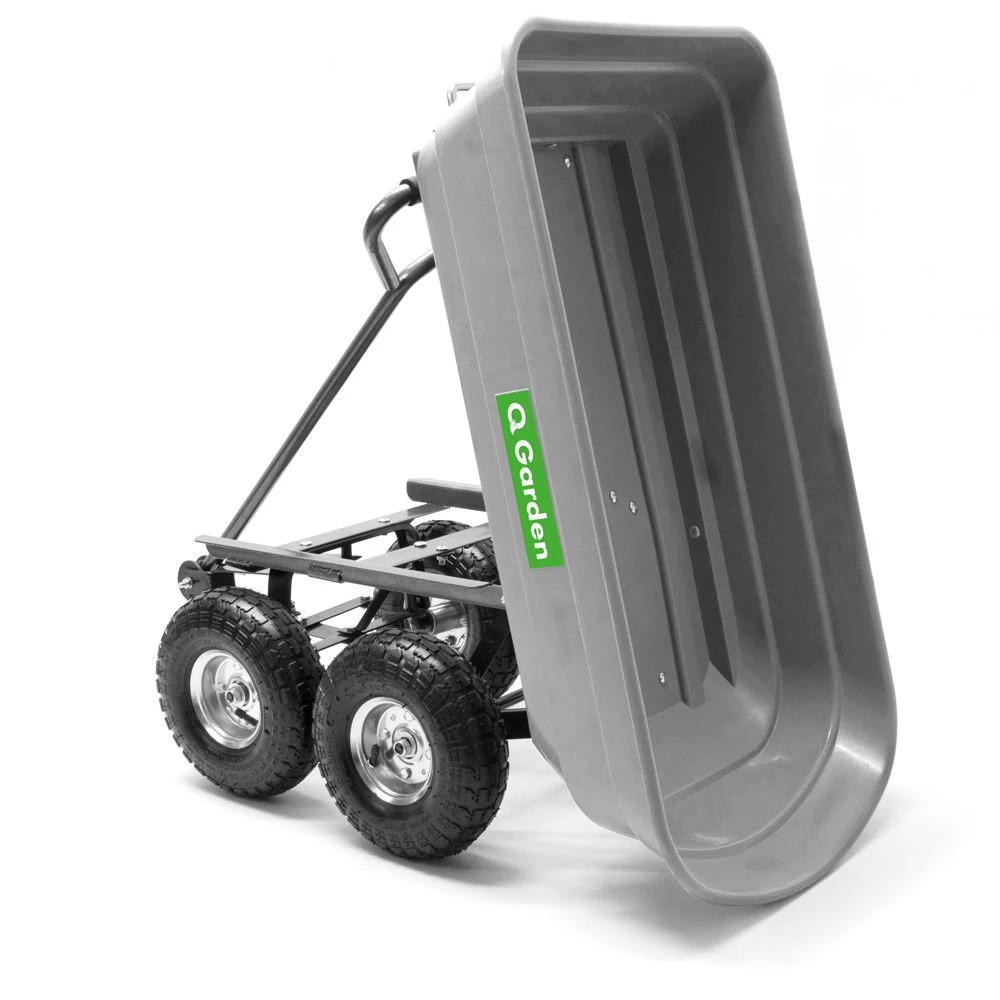 The compact Q Garden poly dump cart features a strong steel frame, heavy duty polycarbonate hopper, tubular D ring handle with gripper and pneumatic wheels.