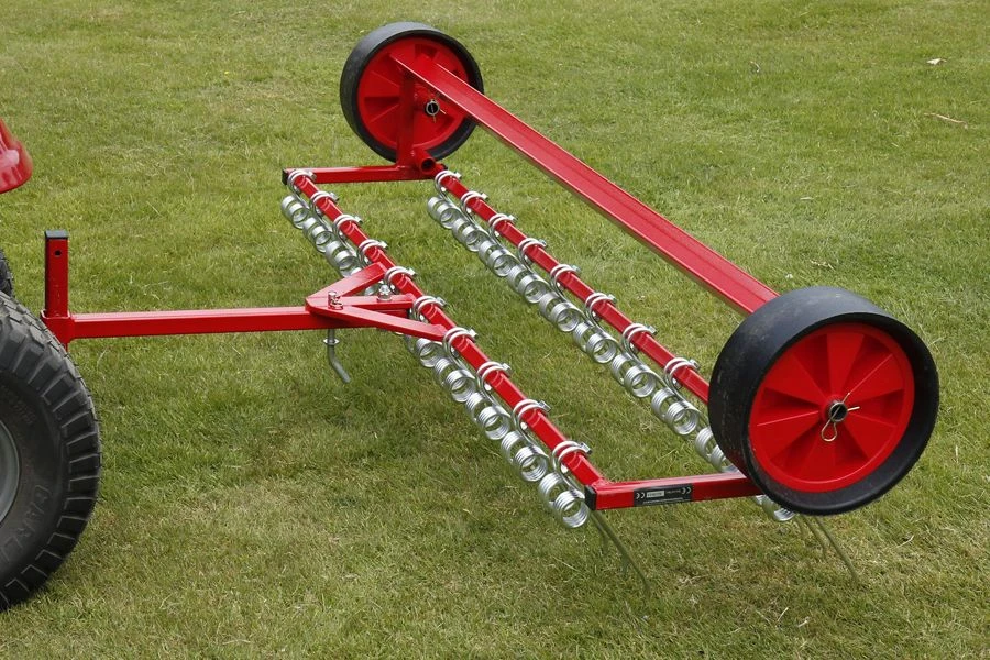 The two rows of heavy-duty spring tines dig into the surface pulling out dead grass. With the transport wheels removed and the unit turned over it becomes a very efficient levelling unit to tackle mole hills and level seed beds.