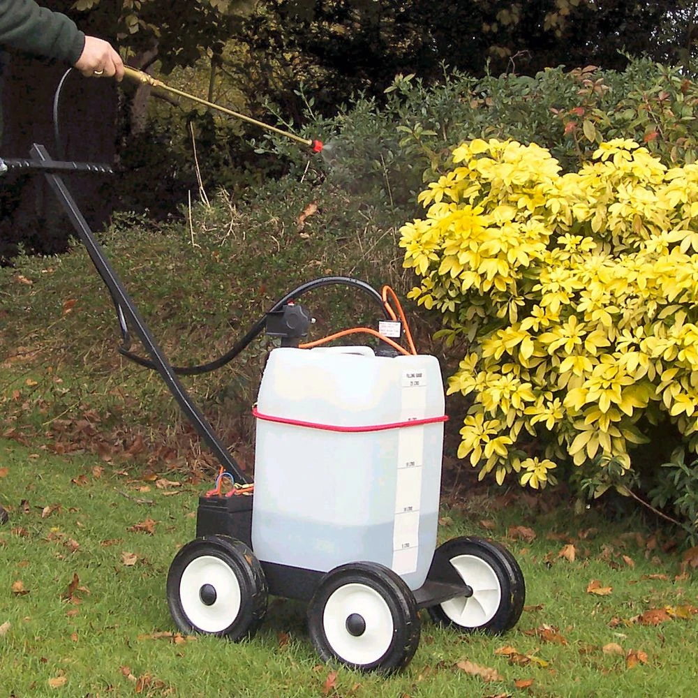 The sprayer pump is powered by its own rechargeable dry cell battery. The battery and charger are included with the unit. The compact sprayer is mounted on a chassis having four 200mm (8″) rubber tyre wheels making it extremely stable and easy to manoeuvre.Â