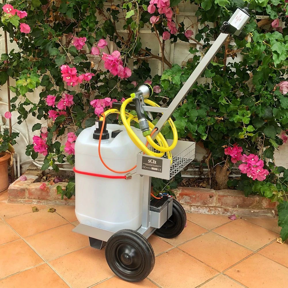 Water can be directed where it is needed using the lightweight trigger lance. There is also a small container for collecting plant groomings. A manual handle makes the transporting of the unit up and down stairs and van loading an easy operation. For extra versatility, the water tank can be removed leaving a very useful trolley to transport plant containers.