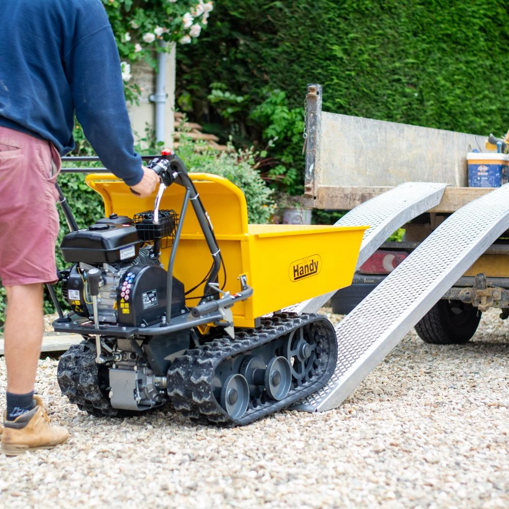 The Handy THLC09715 mini transporter will allow you to shift up to 300kg of materials in landscaping and mini construction applications. The machine runs along two 180mm wide continuous tracks for stability and traction, which cover the six wheels to give a smooth and steady ride, even over the roughest, most inaccessible terrain. The hopper (which measures 86cm in length, 63cm in width and 29cm in depth) has a useful dump function to help empty the contents easily before loading up again.